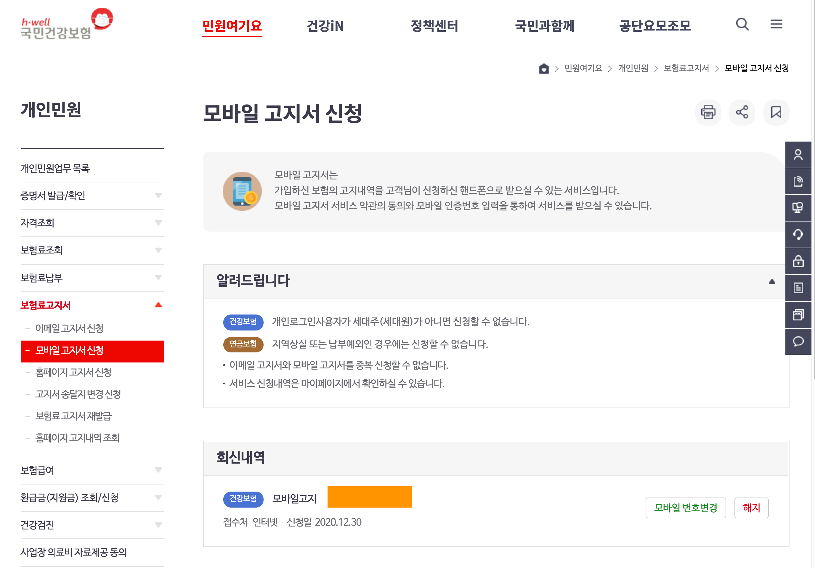 건강 보험/국민 연금 고지서를 E메일로 받는다+자동 이체 신청하는 2011년부터 사회 보험 징수 통합 제도라는 것이 시행되고 건강 보험 국민 연금 고용 보험 산재 보험 업무 속에서 유사 중복성 높은 보험료 징수 업무를 국민 건강 보험 공단이 통합 운영하는 제도이다. 즉, 건강 보험 공단의 모든 공지로 징수 업무를 담당한다는 뜻이다. 집에 우편 배달되는 고지서는 귀찮기도 하고, 놓치기 쉽다. 그럼 건강 보험 공단 징수 포털에서 건강 보험&국민 연금 모바일/E메일 고지 신청, 그리고 자동 이체 신청하는 방법을 알아보자. 주 지역 가입자<->직장 가입자 등 자격이 변경되면 이 모든 판정 신청을 다시 해야 한다. 고지서를 모바일/E메일로 받기는 드물게 E메일 고지서와 모바일 고지서를 중복 신청할 수 없다. 왜요?_?국민 건강 보험:www.nhis.or.kr/nhis/minwon/jpAda00201.do개인 민원>보험료 고지서>이동/메일 고지서 신청