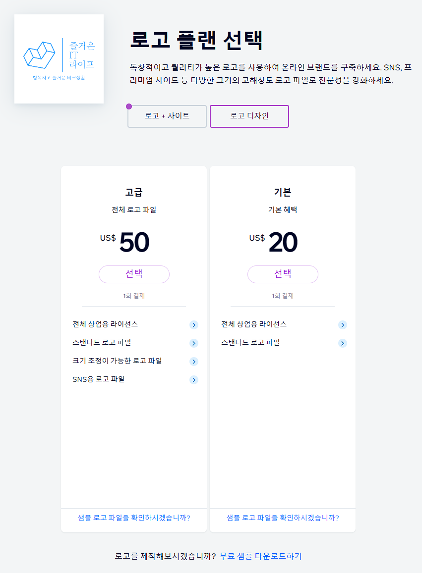 완성된 로고의 구매 페이지입니다. 고급 및 기본을 확인하고 유료로 상업적으로 이용 가능한 고해상도 로고를 만드십시오.