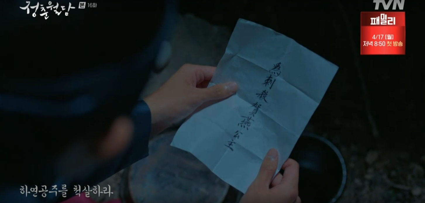 태강은 하연공주를 죽이는 쪽지받을 것이다. 태강은 고개를 끄덕이며 쪽지를 불태우는 무진 사부에게 보여주었다.