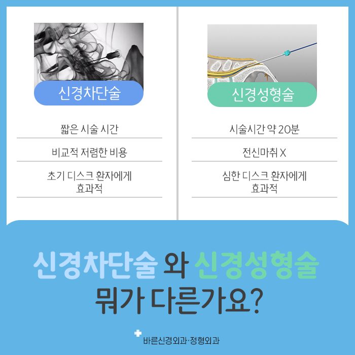 신경 성형술과 신경 차단술에 사용되는 약물은 거의 동일하며 투여 깊이와 용량만 다릅니다. 신경 성형술은 더 많은 약물을 사용하기 때문에 가장 큰 차이점 중 하나는 사용되는 약물의 양입니다. 주사보다 더 큰 효과가 있습니다. 또 다른 차이점은 카테터를 사용하여 약물을 주입할 수 없는 깊이까지 약물을 주입하기 때문에 약물의 효과를 극대화하기 위해 배치하는 것입니다. 신경성형술은 꼬리뼈를 따라 카테터를 삽입해 신경 주변 여러 곳에 약물을 주입하는 시술로 한 번의 수술로 여러 병변을 제거할 수 있어 신경 차단 주사와는 많이 다르다고 할 수 있다.