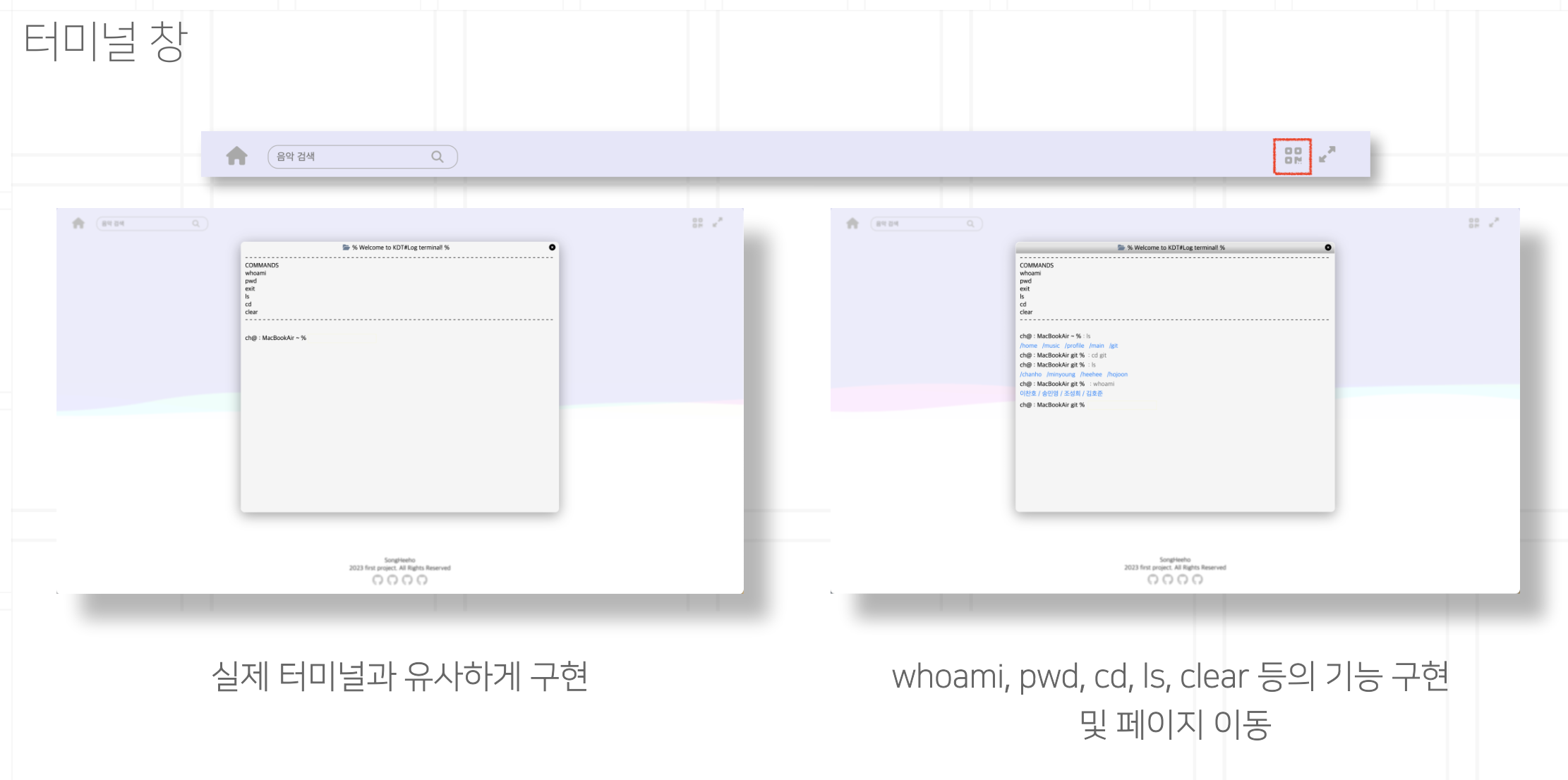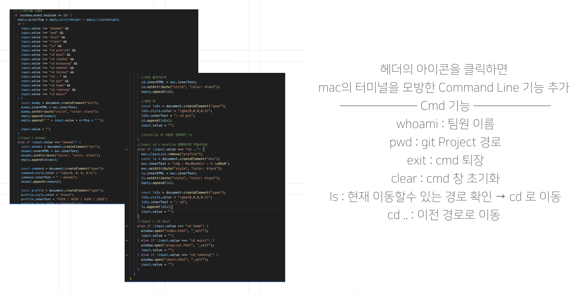 파트는 총(메인,차트,뮤직,프로필,터미널)으로 나누어지며, 팀원 4명이 순차적으로 총 전공 분야를 배정했다. 제 분야는 터미널(cmd)과 프로필을 만드는 것이었습니다.