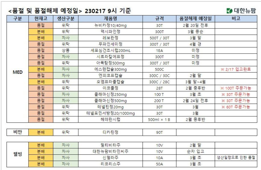(대한뉴팜) 품절 및 품절예정일