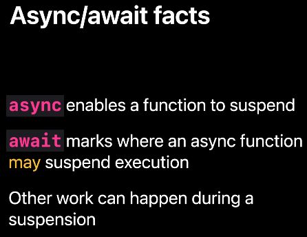 이는 기존 멀티스레딩의 단점으로, 비동기 코드가 실행 중일 때 코드가 제어를 포기할 때까지 CPU 코어가 정상적으로 복구할 수 없습니다. (작업이 더 이상 필요하지 않더라도 리소스를 소모하고 작업을 실행합니다.) 반면 Swift 5.5 동시성 모델은 await를 사용하여 서스펜션 포인트, 작업 계층이 있습니다. 일시 중단 지점에서 주어진 코드 조각이 await 덕분에 일시 중단 및 재개를 반복하면 런타임에 확인할 수 있으며 취소할 수도 있습니다.