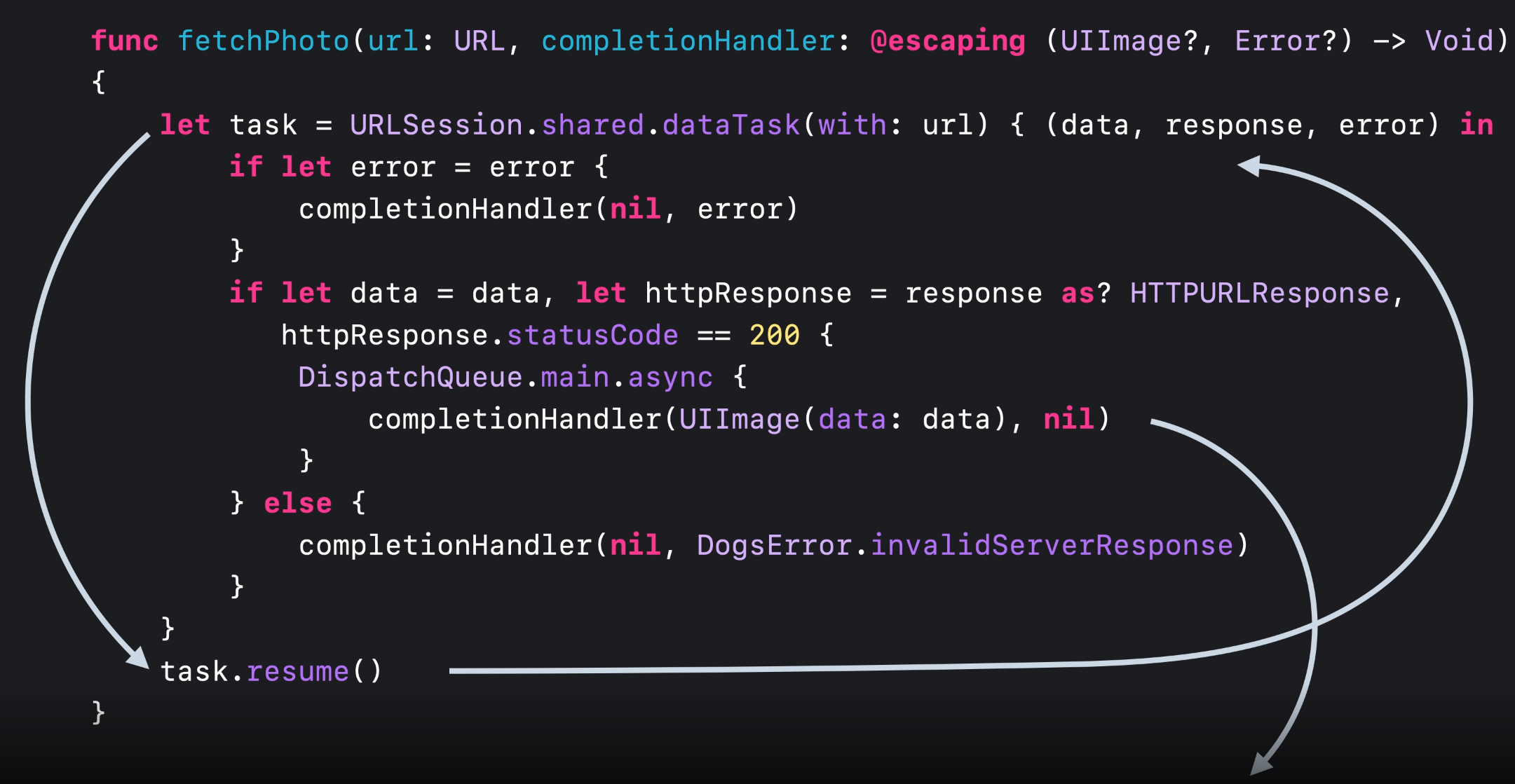 무엇보다 많이클로저에서 데이터를 처리한 후 다시 호출하여 성공적으로 데이터를 반환한 값을 completionHandler fetchPhoto 매개 변수로 UIImage에 전송해야 합니다. fetchPhoto가 UIImage를 직접 반환할 수 없는 이유는 두 번째 매개변수 종결자 ‘~ 아니다’ 그런 얘기니까.
