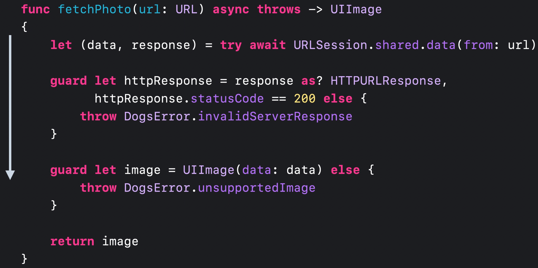 위에서 언급한 기존 비동기 함수에서는 오류가 발생할 때마다 fetchPhoto “completionHandler” 매개 변수의 인수 값으로도 전달되었습니다. 저는 fetchPhoto에 CompletionHandler를 많이 썼습니다(코드 길이를 늘림).